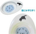 タマゴのかたちをした、ユニークなフードボウルに浅皿タイプです。 従来の約半分の高さで猫ちゃんや小さなワンちゃんにも食べやすくなりました。お皿を持ちやすくしたり、陶器で有名な岐阜多治見市のメーカーさん製造で、猫ちゃんの安全性を考慮した結果、タマゴ型のお皿になりました。ふちには魚を狙って下を覗き込んでいる黒猫が1匹。 お皿の底には水たまりの中を泳ぐ魚たちのイラスト入りです。 魚のイラストで書かれた「ICAT」の文字が遊び心のあるデザイン。フードを入れた状態だと、黒猫がフードを狙っているようで可愛い。