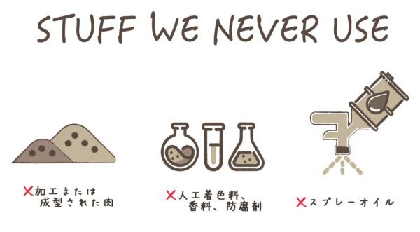 人工的なもの(フレーバー強化スプレー・オイルスプレー等)は使用せず、簡潔でシンプルに