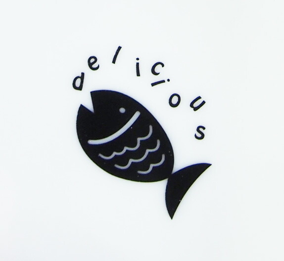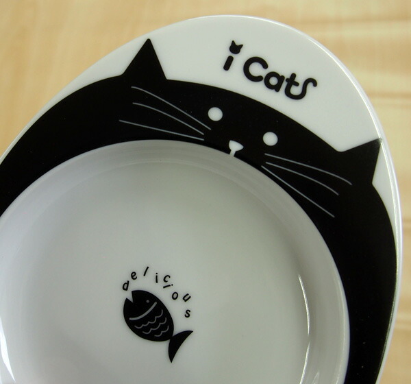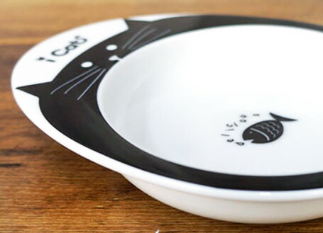 猫ちゃんが大きくお口を開けた縁取りのデザインにお皿の中央にお魚さんのイラストが描かれているのもユニーク。